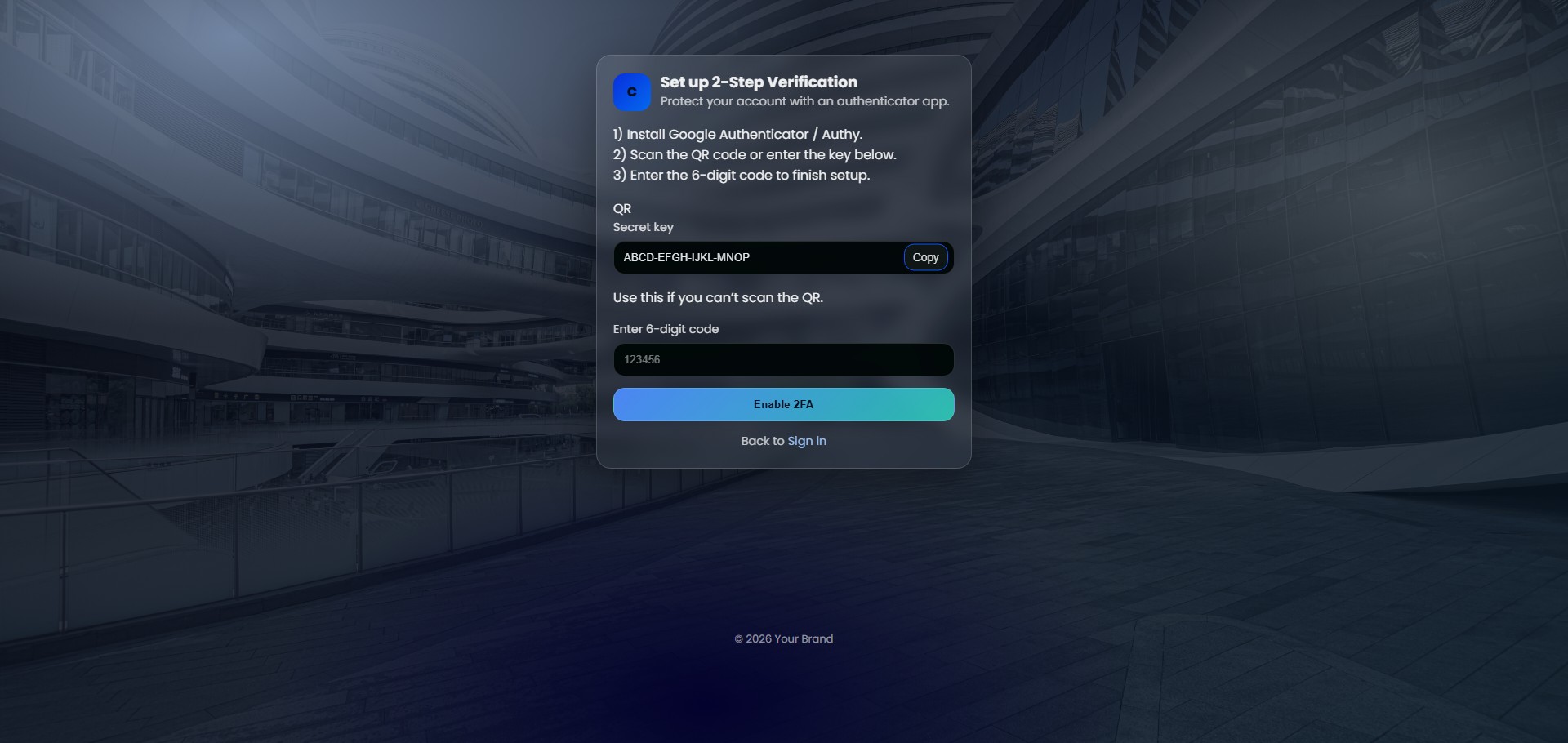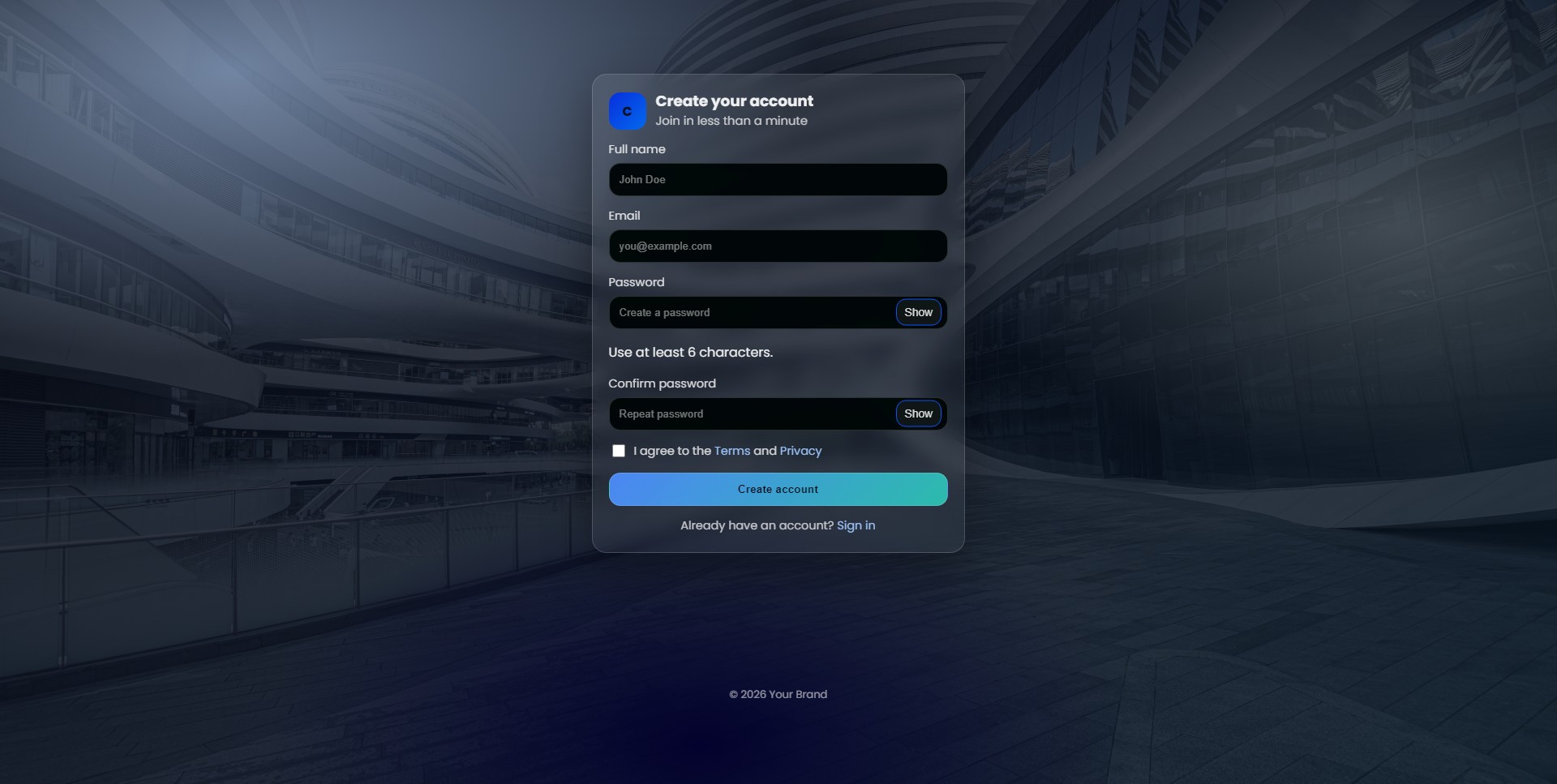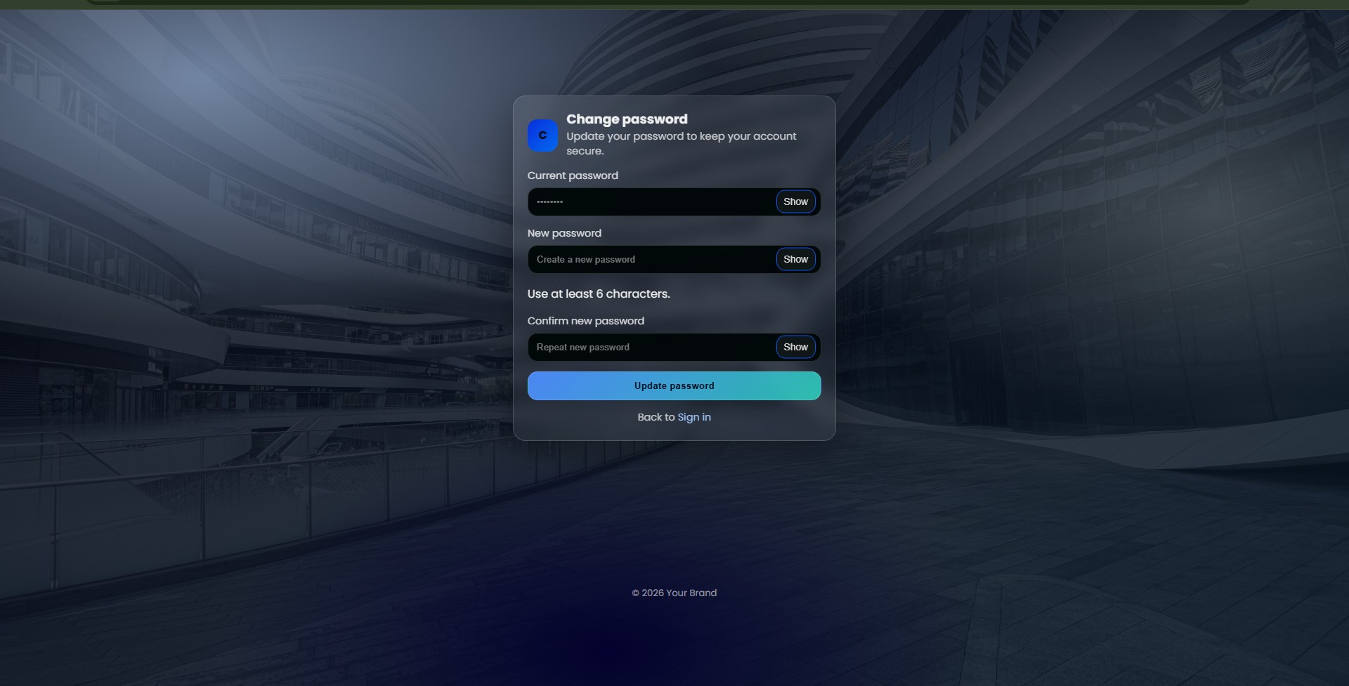 Login page Register / Sign-up page Forgot password page Reset password page Email verification / success How to use: Open any .html file in your browser to preview Edit text, colors, and layout via the main CSS file Replace background image easily in the assets folder Limitations: UI only (no backend authentication logic) No form validation or database connection included